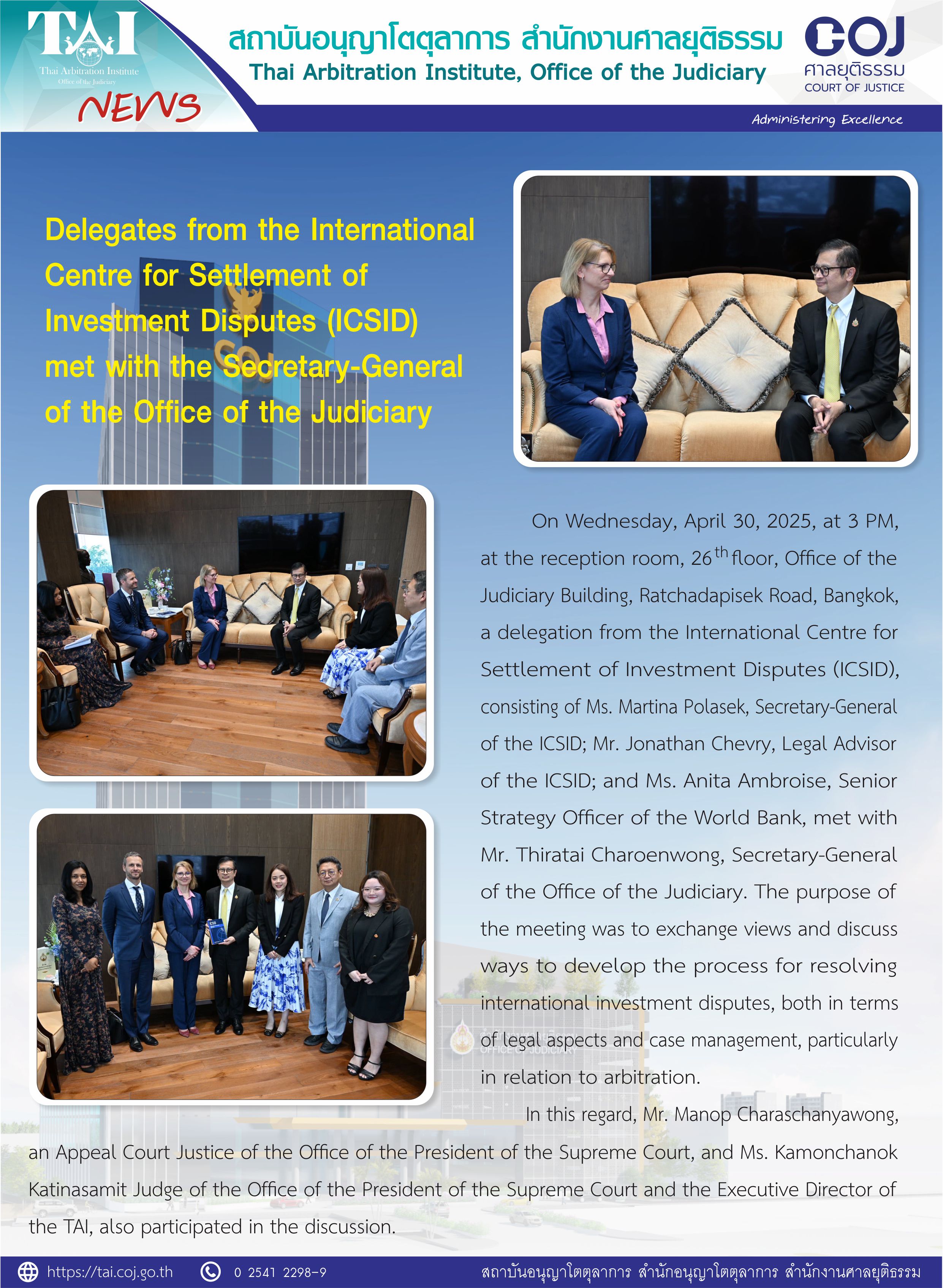 On Wednesday, April 30, 2025, at 3 PM, at the reception room, 26th floor, Office of the Judiciary Building, Ratchadapisek Road, Bangkok, a delegation from the International Centre for Settlement of Investment Disputes (ICSID), consisting of Ms. Martina Polasek, Secretary-General of the ICSID; Mr. Jonathan Chevry, Legal Advisor of the ICSID; and Ms. Anita Ambroise, Senior Strategy Officer of the World Bank, met with Mr. Thiratai Charoenwong, Secretary-General of the Office of the Judiciary. The purpose of the meeting was to exchange views and discuss ways to develop the process for resolving international investment disputes, both in terms of legal aspects and case management, particularly in relation to arbitration.