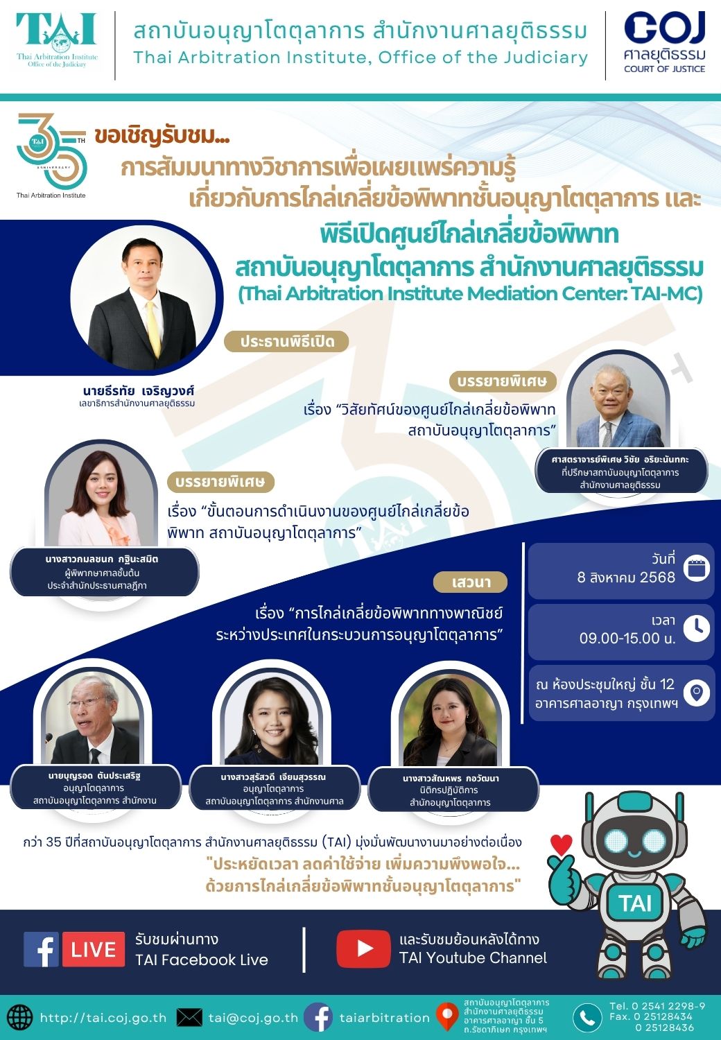 ขอเชิญรับชม... การสัมนาทางวิชาการเพื่อเผยแพร่ความรู้เกี่ยวกับการไกล่เกลี่ยข้อพิพาทชั้นอนุญาโตตุลาการ และพิธีเปิดศูนย์ไกล่เกลี่ยข้อพิพาท สถาบันอนุญาโตตุลาากร สำนักงานศาลยุติธรรม