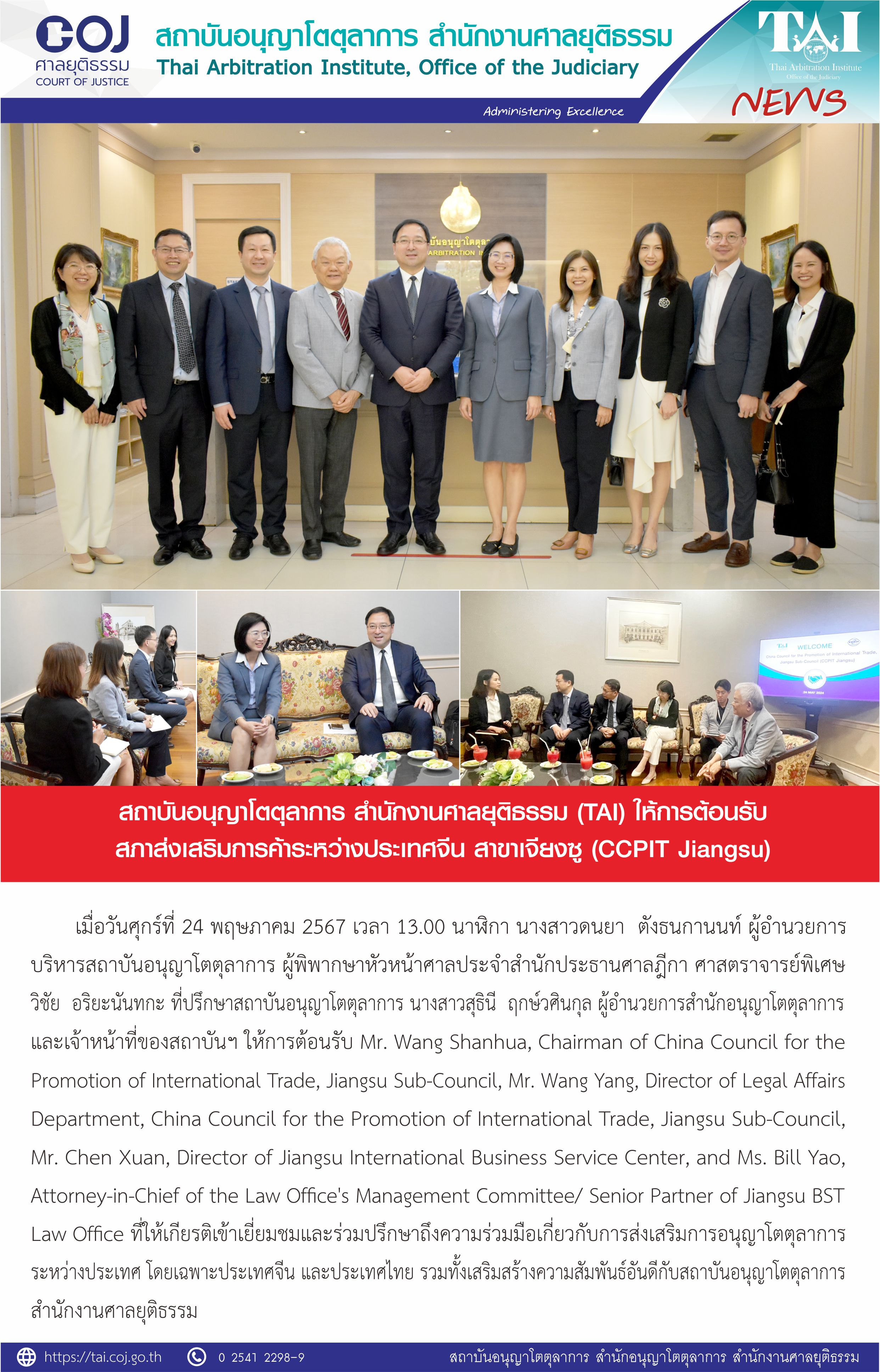 เมื่อวันศุกร์ที่ 24 พฤษภาคม 2567 เวลา 13.00 นาฬิกา นางสาวดนยา ตังธนกานนท์ ผู้อำนวยการบริหารสถาบันอนุญาโตตุลาการ ผู้พิพากษาหัวหน้าศาลประจำสำนักประธานศาลฎีกา ศาสตราจารย์พิเศษ วิชัย อริยะนันทกะ ที่ปรึกษาสถาบันอนุญาโตตุลาการ นางสาวสุธินี ฤกษ์วศินกุล ผู้อำนวยการสำนักอนุญาโตตุลาการและเจ้าหน้าที่ของสถาบันฯ ให้การต้อนรับ Mr. Wang Shanhua, Chairman of China Council for the Promotion of International Trade, Jiangsu Sub-Council, Mr. Wang Yang, Director of Legal Affairs Department, China Council for the Promotion of International Trade, Jiangsu Sub-Council, Mr. Chen Xuan, Director of Jiangsu International Business Service Center, and Ms. Bill Yao, Attorney-in-Chief of the Law Office's Management Committee/ Senior Partner of Jiangsu BST Law Office ทึ่ให้เกียรติเข้าเยี่ยมชมและร่วมปรึกษาถึงความร่วมมือเกี่ยวกับการส่งเสริมการอนุญาโตตุลาการระหว่างประเทศ โดยเฉพาะประเทศจีน และประเทศไทย รวมทั้งเสริมสร้างความสัมพันธ์อันดีกับสถาบันอนุญาโตตุลาการ สำนักงานศาลยุติธรรม
