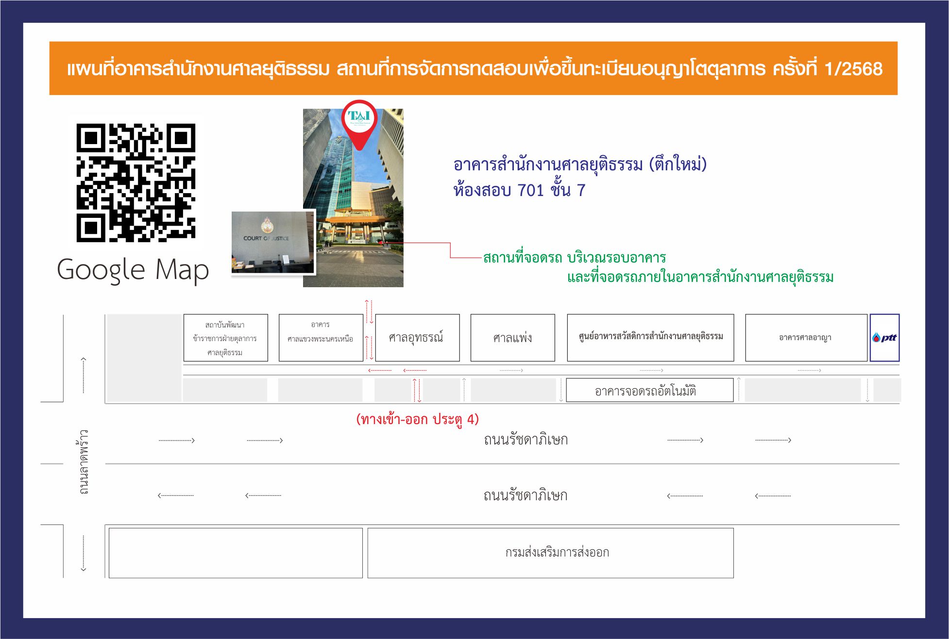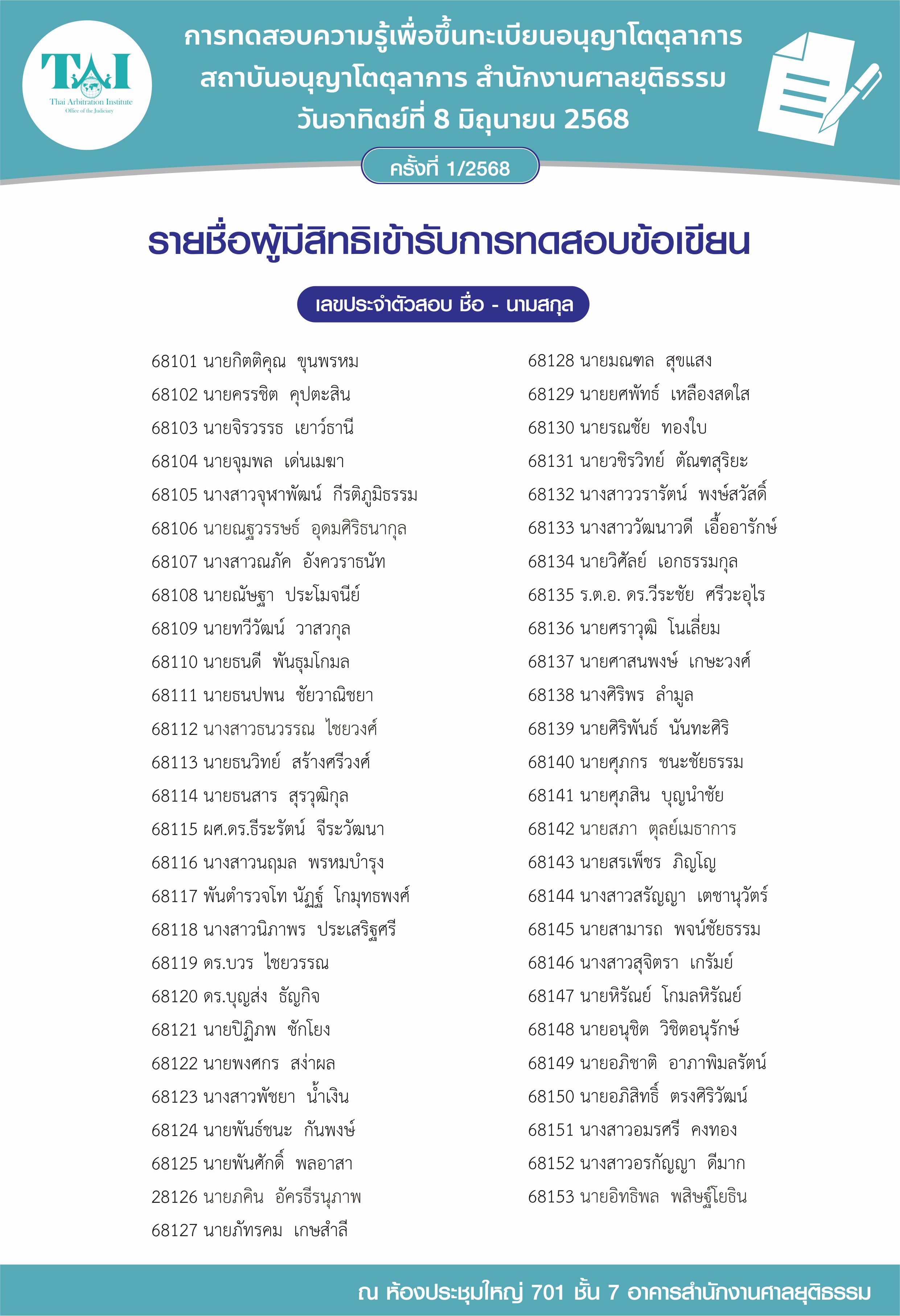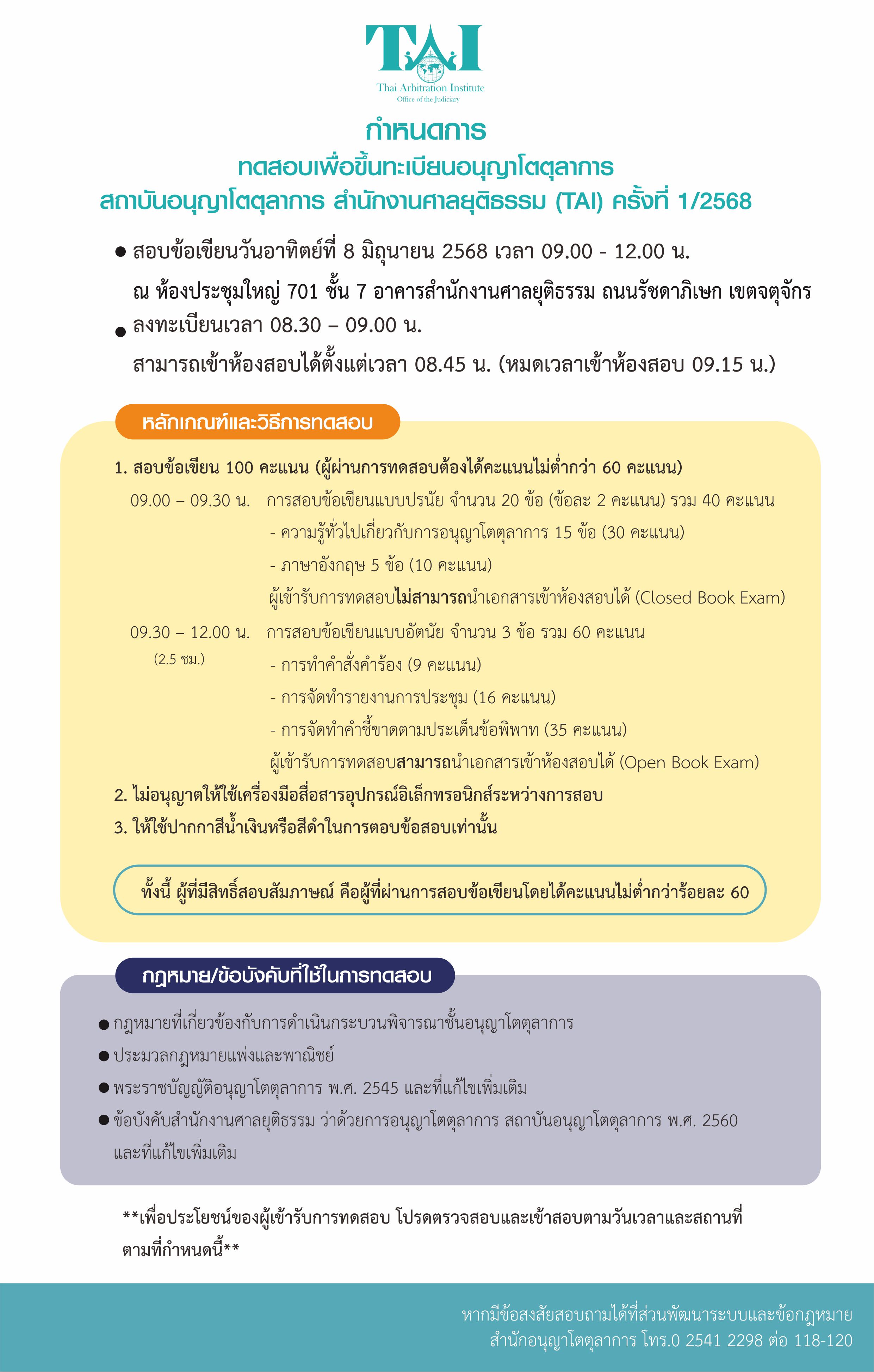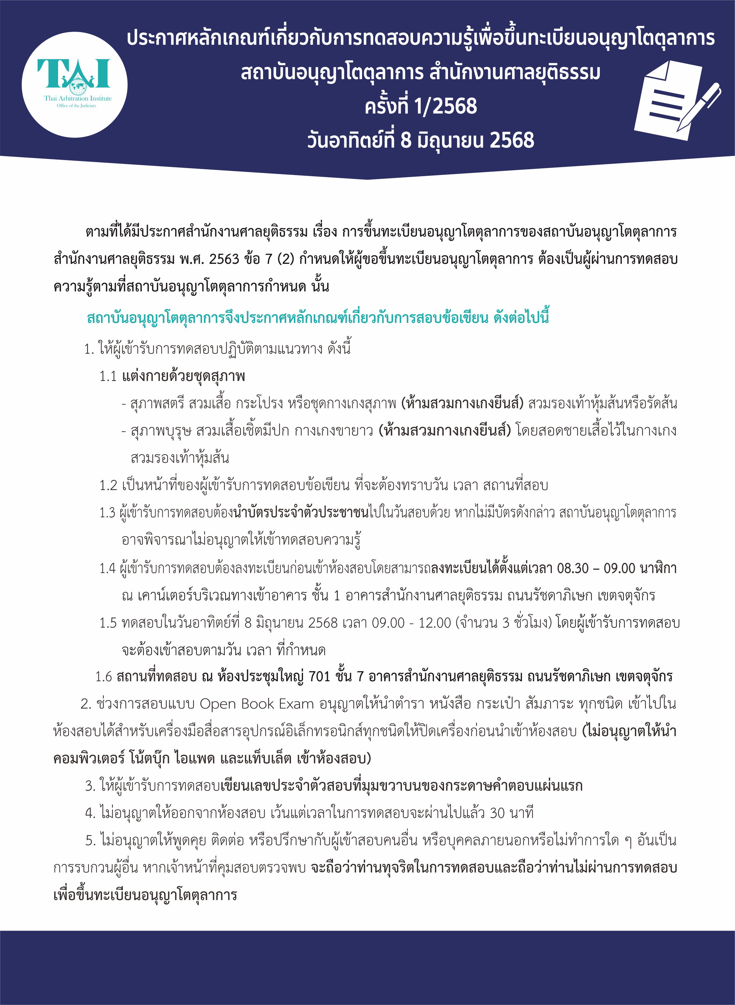 ประกาศรายชื่อ กำหนดการ และรายละเอียดเกี่ยวกับการทดสอบเพื่อขึ้นทะเบียนอนุญาโตตุลาการ สถาบันอนุญาโตตุลาการ สำนักงานศาลยุติธรรม ครั้งที่ 1/2568