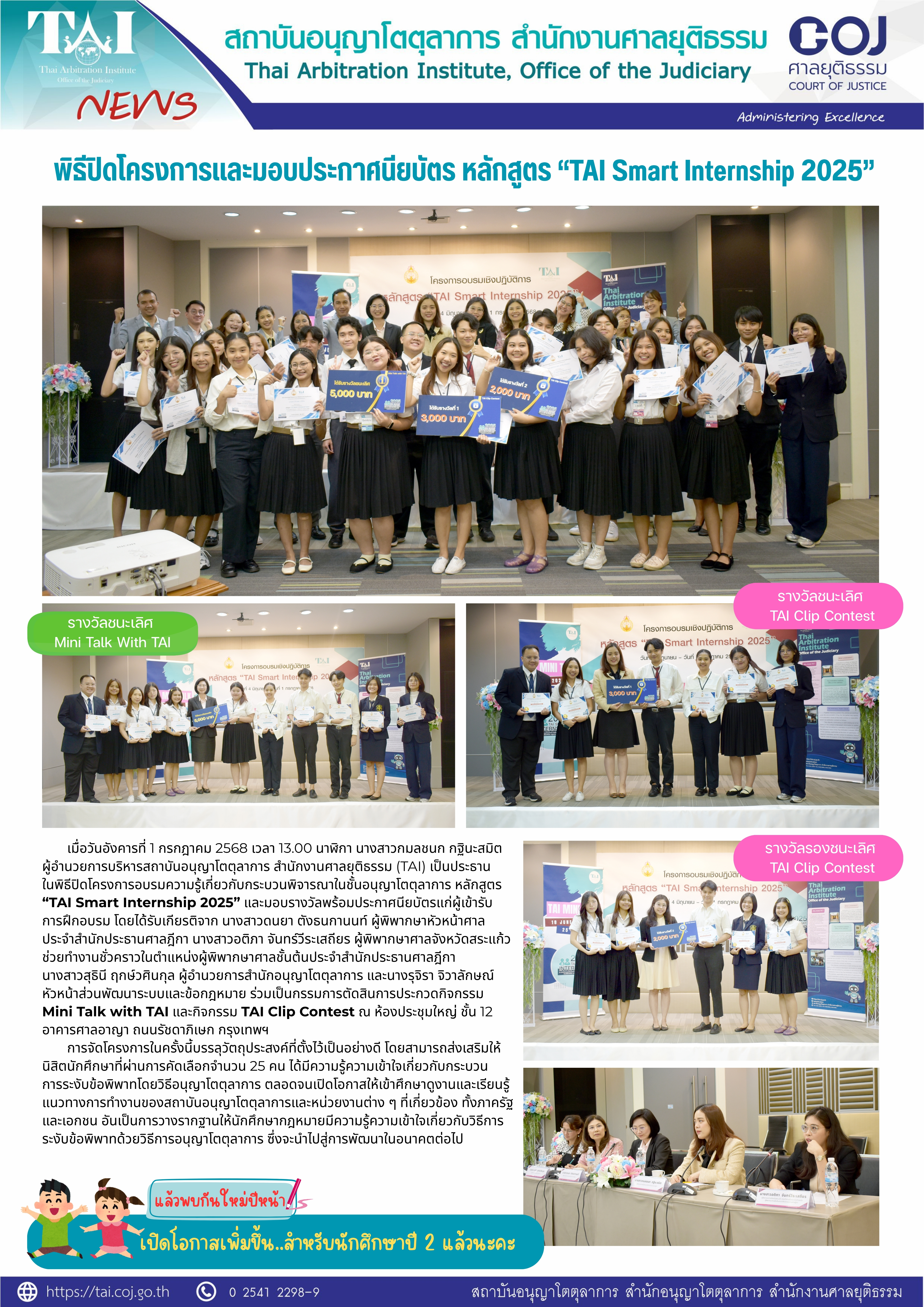 เมื่อวันอังคารที่ 1 กรกฎาคม 2568 เวลา 13.00 นาฬิกา นางสาวกมลชนก กฐินะสมิต ผู้อำนวยการบริหารสถาบันอนุญาโตตุลาการ สำนักงานศาลยุติธรรม (TAI) เป็นประธานในพิธีปิดโครงการอบรมความรู้เกี่ยวกับกระบวนพิจารณาในชั้นอนุญาโตตุลาการ หลักสูตร “TAI Smart Internship 2025” และมอบรางวัลพร้อมประกาศนียบัตรแก่ผู้เข้ารับการฝึกอบรม โดยได้รับเกียรติจาก นางสาวดนยา ตังธนกานนท์ ผู้พิพากษาหัวหน้าศาลประจำสำนักประธานศาลฎีกา นางสาวอติภา จันทร์วีระเสถียร ผู้พิพากษาศาลจังหวัดสระแก้ว ช่วยทำงานชั่วคราวในตำแหน่งผู้พิพากษาศาลชั้นต้นประจำสำนักประธานศาลฎีกา นางสาวสุธินี ฤกษ์วศินกุล ผู้อำนวยการสำนักอนุญาโตตุลาการ และนางรุจิรา จิวาลักษณ์ หัวหน้าส่วนพัฒนาระบบและข้อกฎหมาย ร่วมเป็นกรรมการตัดสินการประกวดกิจกรรม Mini Talk with TAI และกิจกรรม TAI Clip Contest ณ ห้องประชุมใหญ่ ชั้น 12 อาคารศาลอาญา ถนนรัชดาภิเษก กรุงเทพฯ
